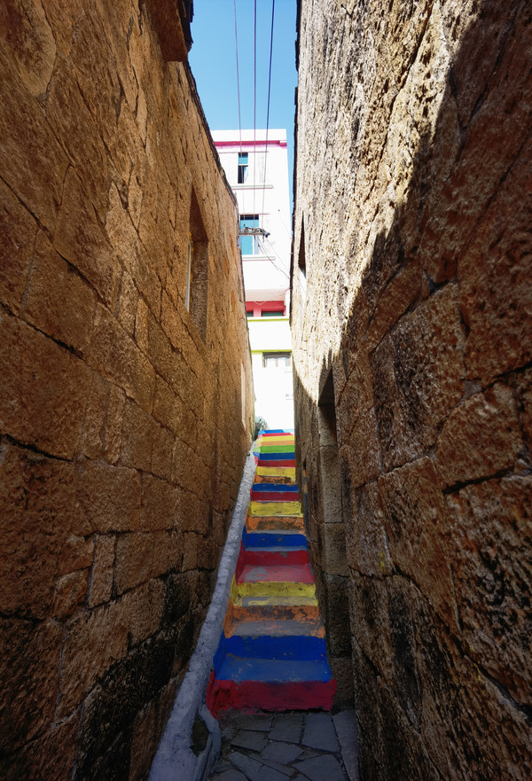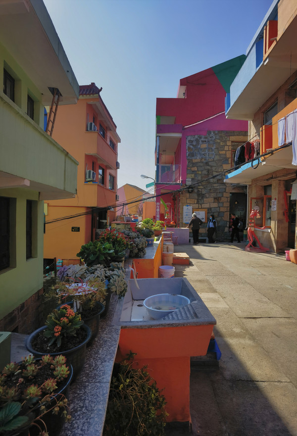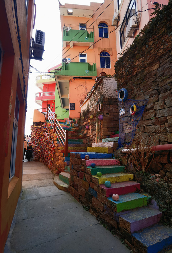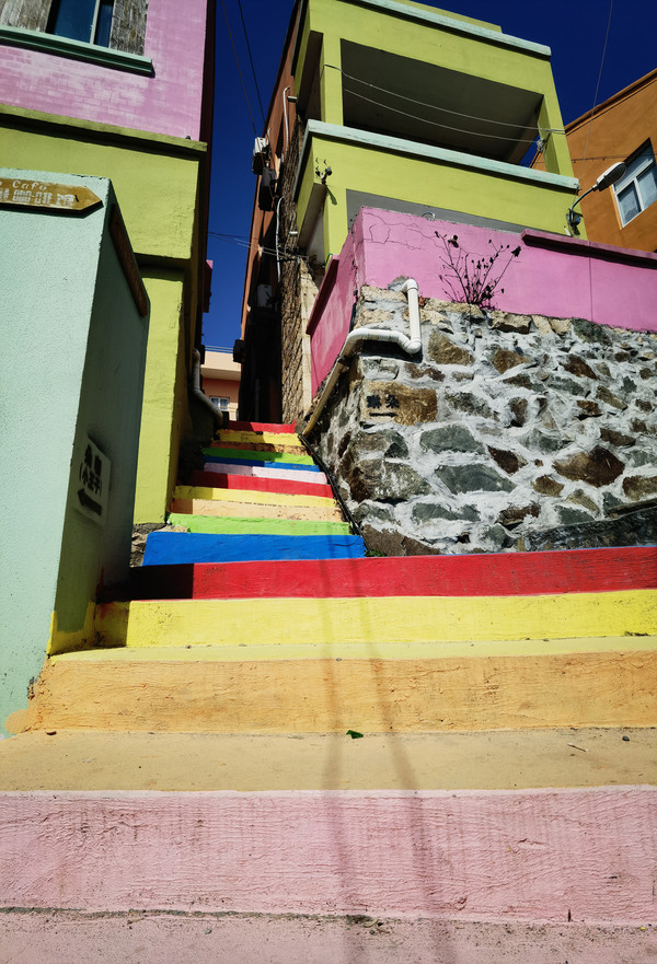 饭后,正式踏入小箬村。村庄里,石头建的房屋外墙,被刷成了色彩斑斓各种不同的颜色,房屋错落有致,各种色彩随机碰撞,任意搭配。随便走走,感觉从任一个方向、任一个角落都能拍出大片。街巷间,五颜六色的台阶,把绚丽的色彩集中呈现了出来。走在村庄中,仿佛置身于梦幻般的童话世界。马卡龙的色彩冲击,给人带来身心的愉悦。