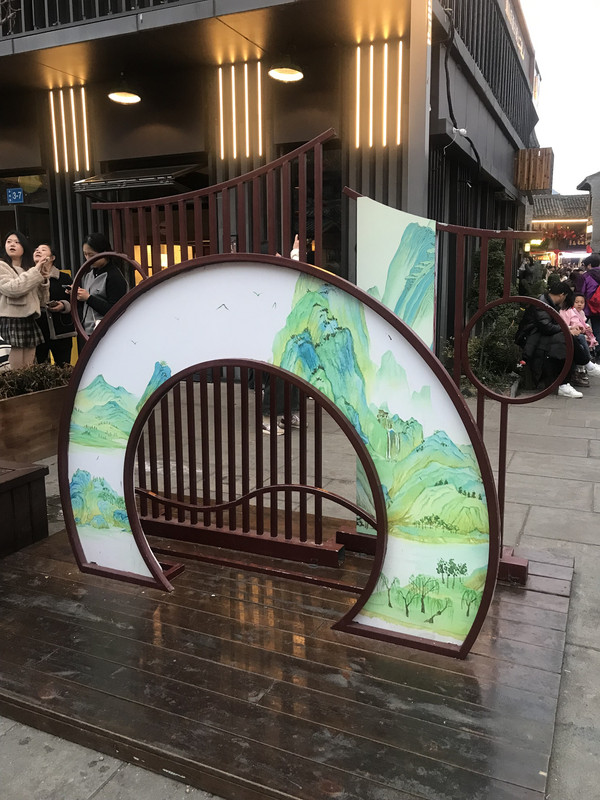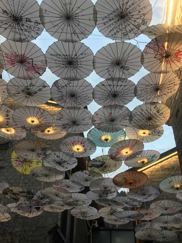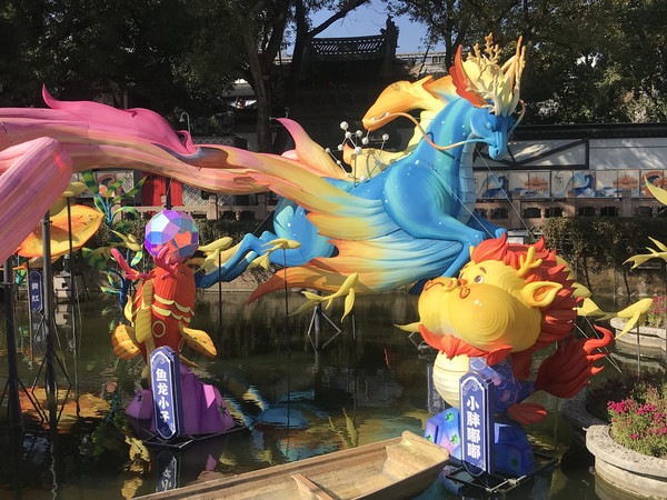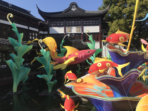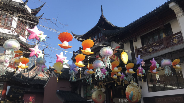 在商城里闲逛,九曲桥两侧的池塘中布满了大型花灯,店铺门前空闲处也都大张旗鼓地做了装扮,整个商城被各色彩灯装点得很有节日氛围。围着商城转了一圈,没有进豫园和城隍庙,我俩骑车回酒店休息了。