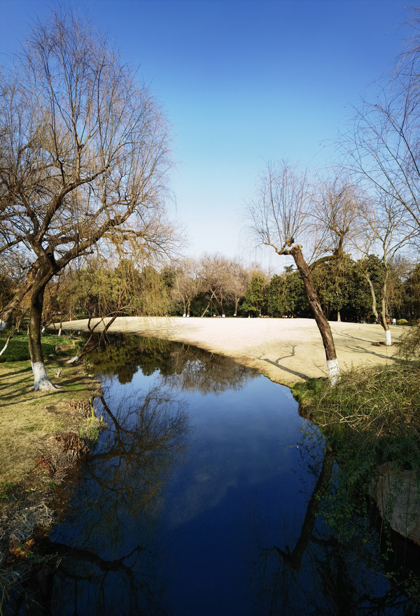 路过钱王祠,门口车流人流乱成一团,舍弃了去看梅花的冲动,继续前行,来到了柳浪闻莺。园区里同样是满满的人群,柳枝还没有抽出柳叶,枝条有的高昂,有的弯垂,小溪映衬出另一片蓝天,冬景也那么柔美。