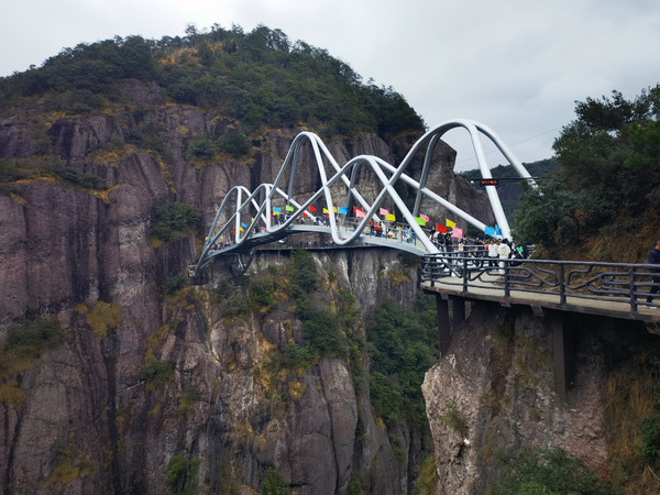最早看见的台州的照片,是神仙居的如意桥。整体造型好似中国的玉如意,横跨于两座高山之间,下面就是万丈深渊。从远处看桥全景,很有视觉冲击感。