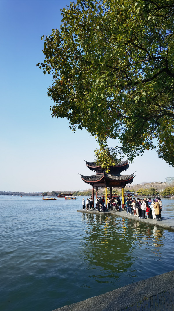 饭后,直奔西湖边。这是我们多次与西湖相遇,感受到人流最壮观的一次。人墙把西湖围了起来,不走到近前,根本无法看到西湖美景的真容。好的地点,取景拍照点要排队,乘船买票要排队,要想照张不是大合影的单人照片,真是挺有难度的。我们跟随着人群,从音乐喷泉附近沿西湖岸向南慢慢挪动,电瓶车缓缓地穿梭于人群中,每辆车都座无虚席的,转角处,又见到了之前多次出现在我们西湖的照片中,那个熟悉的小亭子。