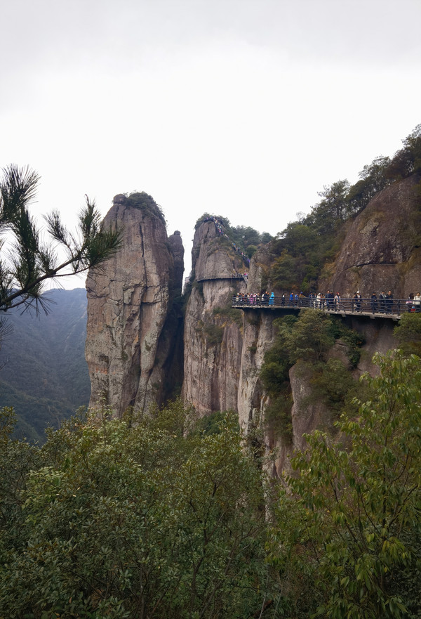 莲花台宛如一朵盛开的莲花,从山峰高处深入深谷的观景台,是游客排队拍照的必选打卡点,我们高举自拍杆,取了一张景色的照片,没有挤入排队的队伍。