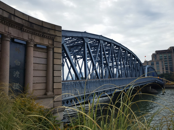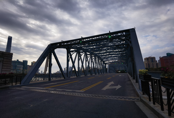 第二天,我俩早早地来到了外滩,今天回家了,来与外滩、与大上海做个告别。天阴沉沉的,云朵很多,几乎看不到人影,与昨晚的人声鼎沸形成了鲜明的对比。我们任意地找角度,又拍了很多照片。走到外白渡桥,老公竟然走到马路中间,以正面的角度照了照片。云彩叠叠的照片很有意境。