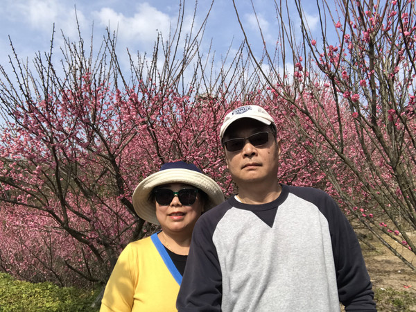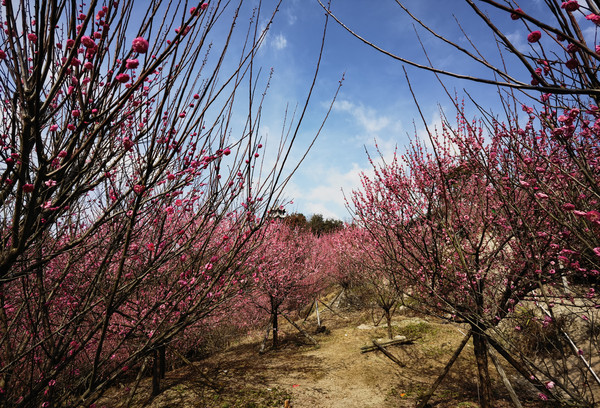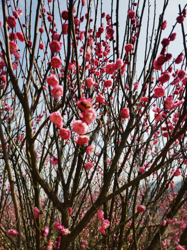 一路思想斗争,休息了几次,终于爬上了山顶,来到了梅园。一大片的梅花花海,好漂亮啊,我顾不得休息,急忙走到梅花丛中拍照。冬日里,玫红色的梅花显得更加妩媚动人。小蜜蜂在花丛中飞来飞去,几乎每棵梅花树上面都有它们的身影,不由得我有些顾虑紧张,都忘了近距离地去闻一下梅花的花香了。今天的天空很给了,蓝天、白云、远山、梅海,好一幅冬日美卷。