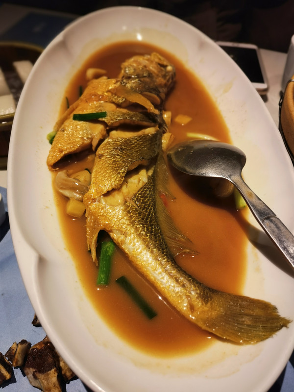 为了吃这顿晚饭,等候的太辛苦了,我们按照菜单的十大招牌,点了沙蒜炒豆面、牛仔骨、家烧深海大黄鱼,据说这个大黄鱼是大陈岛的呢!我们在家看过一个介绍台州大陈岛的片子,老公就惦记去,我从心里抵触坐船就没有安排,这大陈岛来的大黄鱼就算是对他的安慰吧。肉真的太鲜嫩了,我贪婪的想要夹过来一大块,都散落在盘中里了,只能动用勺子的帮助;沙蒜炒豆面,沙蒜,是生长在沙砾里的海葵,豆面就是粉丝,炒在一起的味道很好,是荣氏饭馆的代表菜;牛仔骨,味道也不错,牛肉不老又有点嚼劲。总体感觉是:等了三个多小时的这顿晚餐,还是值得的。来台州,总要有一次,与当地起家的餐馆的亲密接触,何况这味道,确实是不错的。