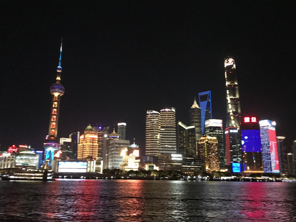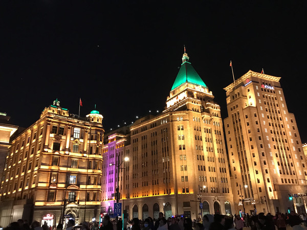顺着人群一路走到外滩,有点大游行的感觉。东方明珠塔不时变换着色彩,放眼望去,整个对岸都灯光闪烁,这一侧,被灯光装饰的各大建筑,脱去了庄重的外衣,比白日增添了柔美。