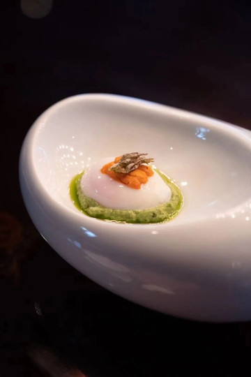 主厨海鹏在俞斌大师麾下,如今深谙“艺术是一个伟大厨师的尽头”。我听他说,受《东京大饭店》启发,有了奶油蘑菇酥盒的想法,蟹料理上面加生姜味奶油冰淇淋,这是木村都会拍案叫好的奇妙想法。 前菜熟醉蟹膏蟹黄,加虾泥增加甘甜层次,明星侍酒师郭莹配如今炙手可热的小农香槟Sève En Barmont 黑中白,那矿物结构与酸度由枕在其下的白菊醋、昆布与柠檬皮做的啫喱细腻承接。