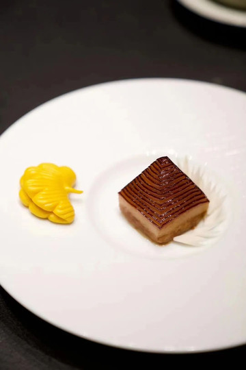 Alan真是调味的魔法师,西双版纳棕榈芯,配了酸辣烟燻味松露啫喱,等于是辣妹牌仙女。他把蘑菇浓汤做成玛奇朵泡沫,因为牛排菌与黑松露的加入,充满旷野的鲜美肉味。但这绝不是心荤身素的“意淫”,“鲜”自然而然醒味发生。法式南瓜板栗迷你饺子,里面是南瓜奶油与河北迁西板栗,一点点鼠尾草与焦色洋葱就精准画龙点睛,精确。
