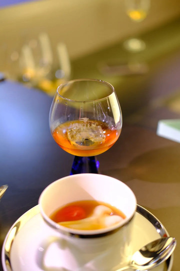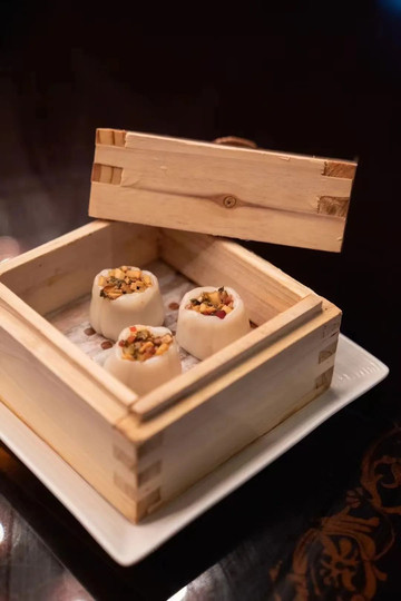 遵照时节,我个人觉得不是说有什么吃什么。中国人是觉得怎么自然对食客好,吃什么。虎跑泉水香梨炖五头花胶,热中润肺,里面多加一味龙脷叶预防秋燥咳嗽,收尾是晶莹的蜜汁秋梨冻,喉咙都亮起来。宋式点茶喂眼睛吃个点心,补进一颗自在好心情。