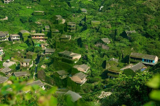 岛上有一座被遗弃的小渔村,高高低低的楼房,缠绕着蓊蓊绿绿的青藤,从远处看就像是童话世界里的景象。