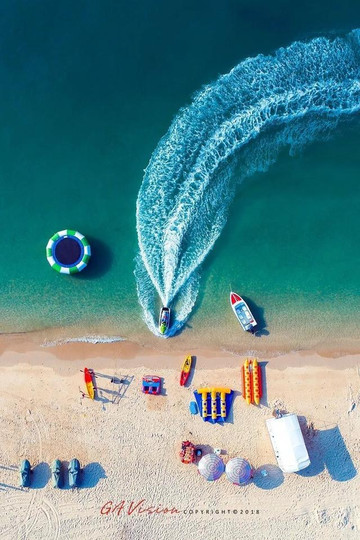 白天碧海蓝天,一望无际,船透风穿梭于波尖浪谷之中,放眼望去,犹如海上的千军万马,尤为壮观。