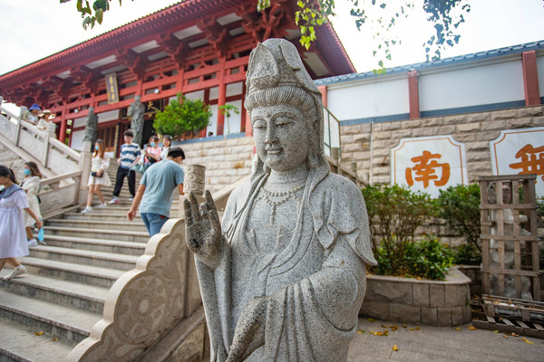 天王殿、大雄宝殿、观音殿、地藏殿、药师殿、三圣殿、伽蓝殿等殿堂一字排开,寺院里的参天古树又显得寺院格调不凡,敬畏之心亦油然而生。