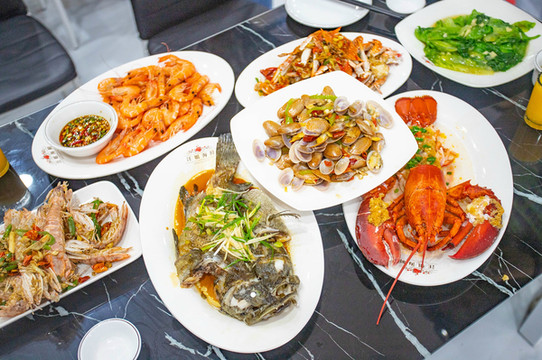 在门口的海鲜橱窗里点上一些海鲜,稍等一会,点好的美食佳肴便来到了我们的餐桌上。