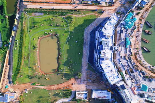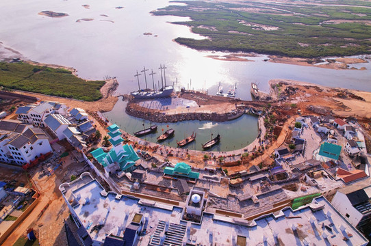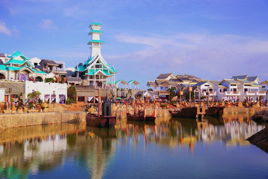 海丝首港建筑的正面以灰白色晕染而成,如同一幅巨型的水墨画,又兼顾西洋建筑的特点,乍一看又像是一张“海上布达拉宫”的胶卷影像片。海丝古港建筑群的后方,则为一圈按照“月牙形”分布的汉韵建筑,有着“ 圣托里尼 ”般的白墙,以及 北海 海水一般碧蓝的屋檐。与传统的汉代建筑不同,沿袭了滨 海城 市受海上丝路的影响,东西方文化交融,催生了这样新潮的海丝古港建筑群。船港里停靠着数艘大船,使得海丝古港的建筑群更有灵性。