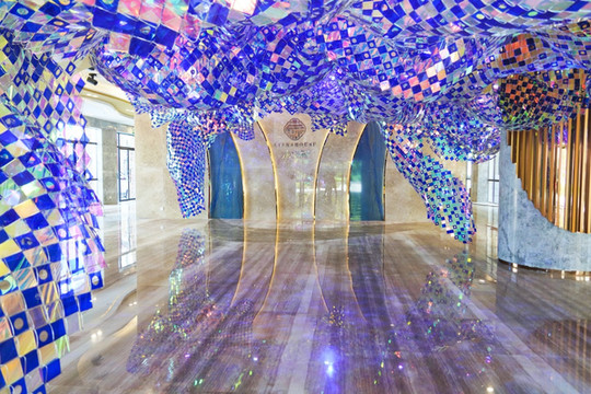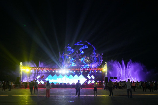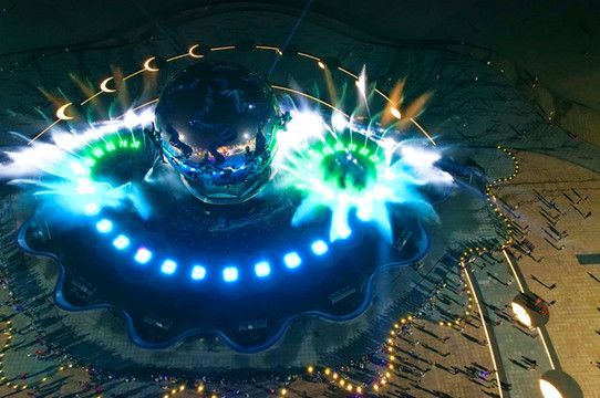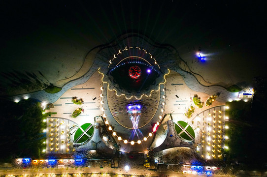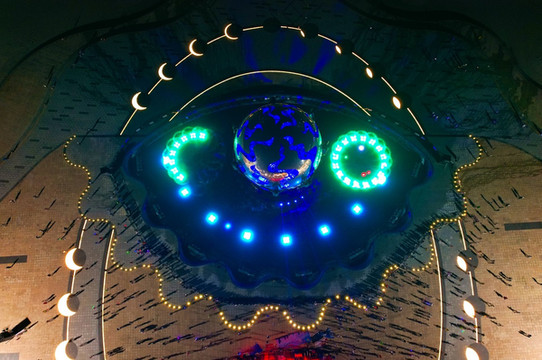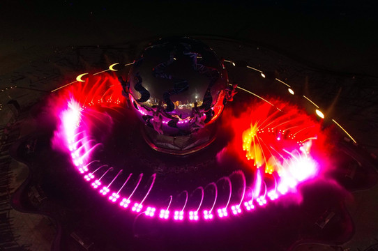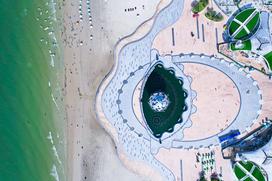 夜幕低垂,华灯初上,伴随着热火朝天的音乐盛宴,潮雕广场的喷泉灯光秀正华丽上演。广场上的灯光与城市的灯火交融,把整个景区营造成了 北海 最浪漫的地方。星辉闪耀,光彩夺目,此时此刻的潮雕广场如同布满珍珠的玉盘向着海边铺散开。从空中俯瞰,潮雕广场形如一只炯炯有神的大眼睛,正审视着绝美的 北海 银滩,奇妙极了。