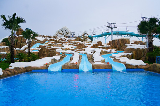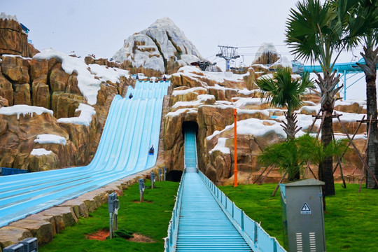 这里虽不是无边无际的大海,却有着比海上羡慕更刺激的漩涡风暴、冰川起伏、水中冰城、极速滑板等惊险刺激的项目。其中,最为特别的就是冰雪主题的滑道,一座庞大的皑皑雪山上,有着“沟壑纵横”“九曲回肠”的滑道,既有温情脉脉版可以享受雪域美景悠闲玩水下滑。也有着接近垂直的高速滑道,如同飞瀑直下般急驰而下,可享受速度与刺激带来的快感与欢乐。除了滑道,还有滑板冲浪、美食风情街等可以游玩的地方。