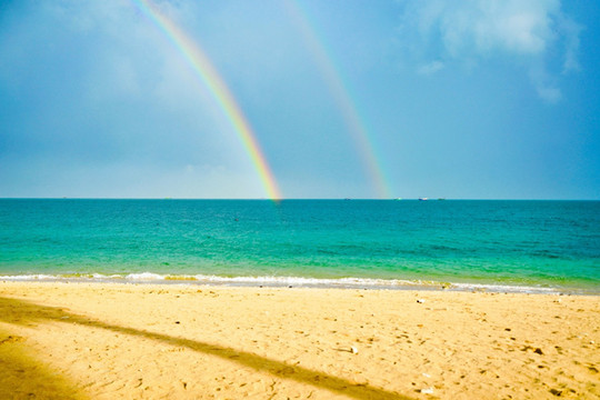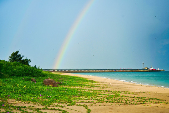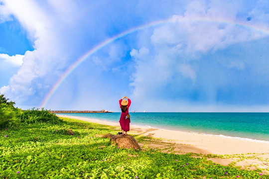 清晨一阵海风吹拂,一片乌云伴随着瓢泼大雨而来。海边气候变换多端,风雨之后,太阳拨开云层,漏出了笑颜。一道半圆弧形彩虹,连接山海之间,另外道则若隐若现地藏在海平面,这也奇妙的胜景,看一次实属幸运之至。