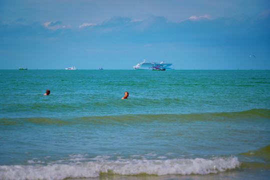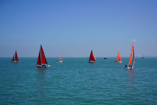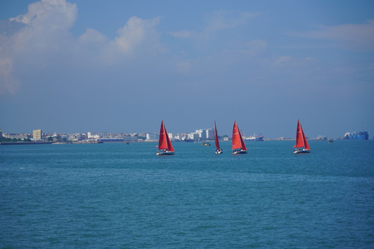 风已经是秋天的味道了,可 北海 的碧海蓝天却未有丝毫变幻。这个山海浸染的秋天,来到美丽的 北海,追寻着清风里的那股咸咸的海味。来到 北海 乘坐 北港 邮21号,伴随着波光粼粼的海面,观赏一望无际的大海,翠绿的冠头岭国家森林公园,以及渔船、船坞、海边渔村等独特的海韵风光。在波涛汹涌海平面,还看到了壮观的帆船竞技,画面尤为壮观。