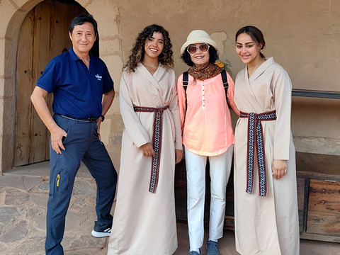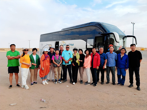 沙特时间:12:00,探秘中东行团队圆满结束埃尔奥拉(欧拉)古城的观光,来到古城中阿拉伯餐厅用午餐。其中意面味道独特最棒。午餐后,团队又开始长途跋涉,向当晚再次启程的机场进发。途中在服务区,为了向几天来为大家热情服务的埃及司机师傅的感谢,在导游吴学峰的建议下,大家同司机留下了一张大合影。