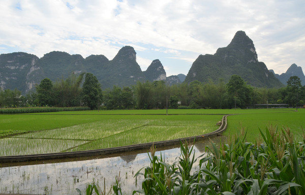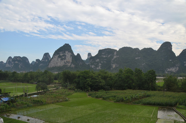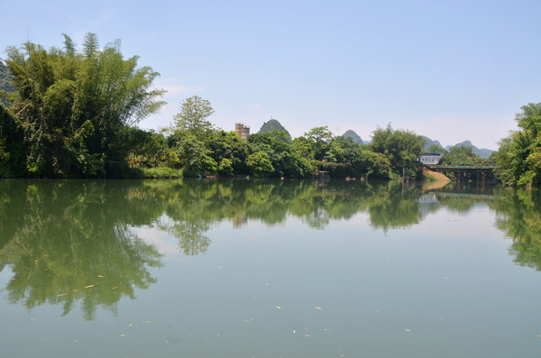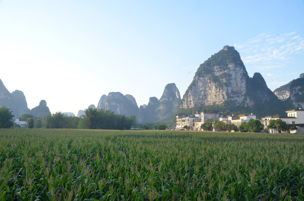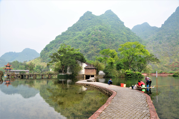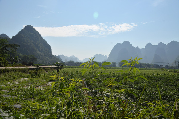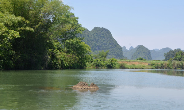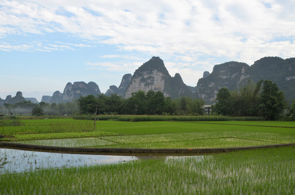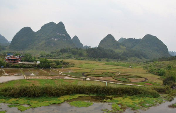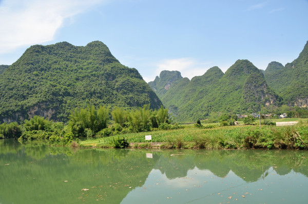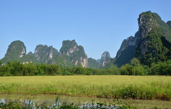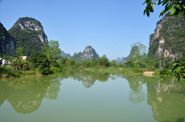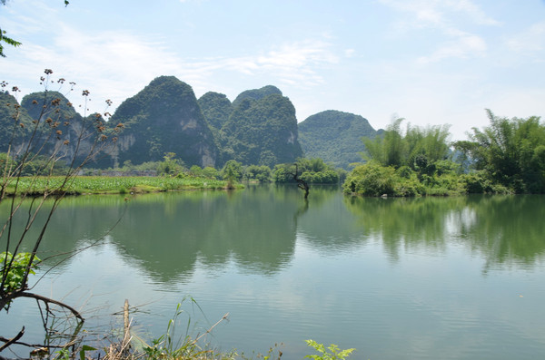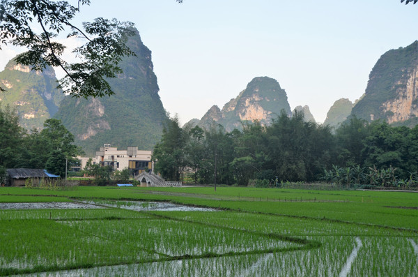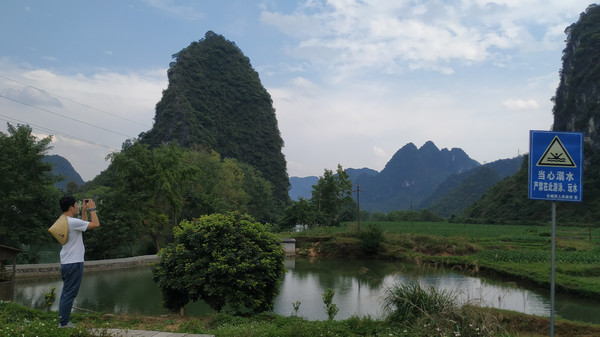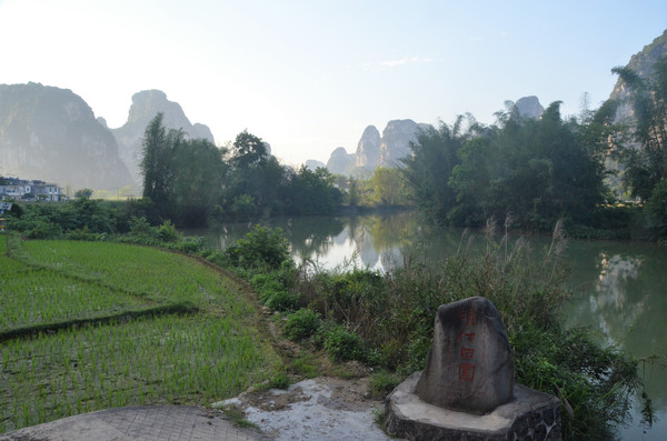 早餐之后,我们开着车在名仕村兜了一圈:明仕田园山水之间皆是稻田,眼光所及皆是绿色,在绿色之中,到处点缀着形态各异的山峰,在山峰点缀下的绿色之间,静静地流淌着弯弯曲曲的清清小河,仿佛是翡翠的碧玉,清澈的河水中,是缓缓飘动的柔美水草,无数的鱼儿自由自在地徜徉在水草之间,几只鸭子游过,泛起无数的涟漪,打碎了山峰宁静的倒影并扩散到岸边。。。喀斯特地貌的美轮美奂在这里得到了充分的展示。(此景点免门票)