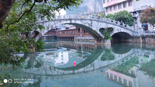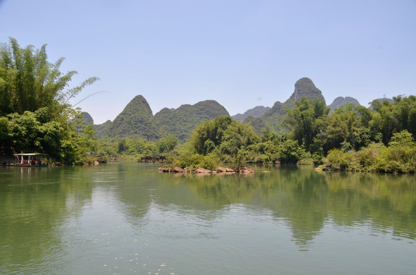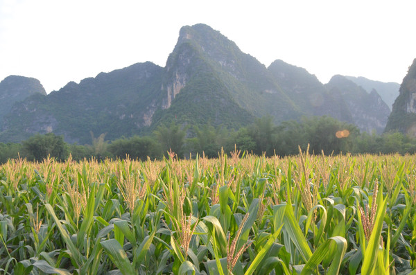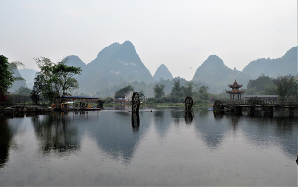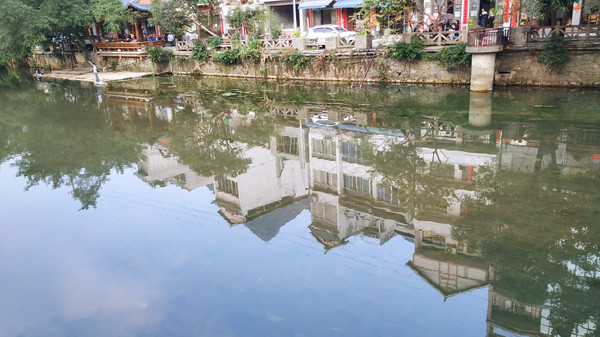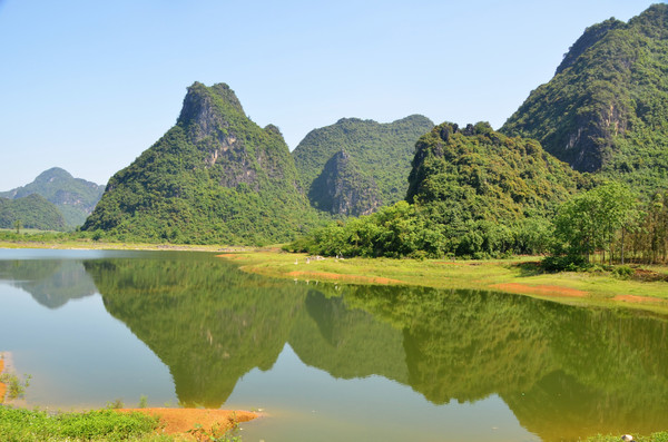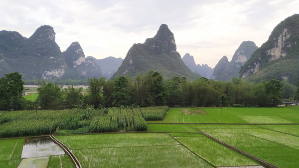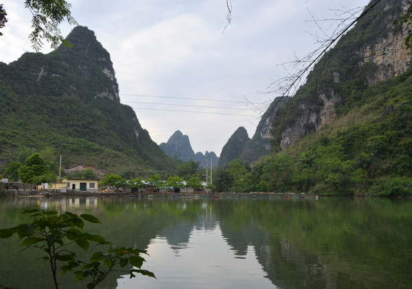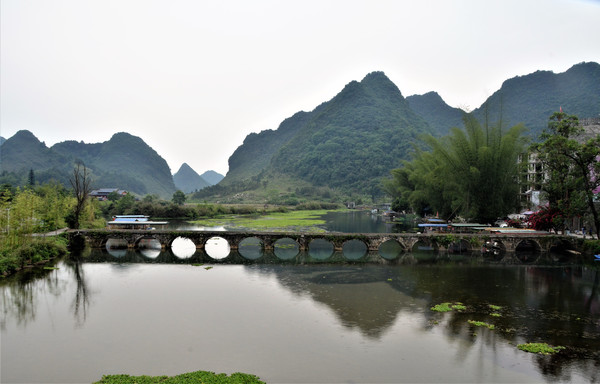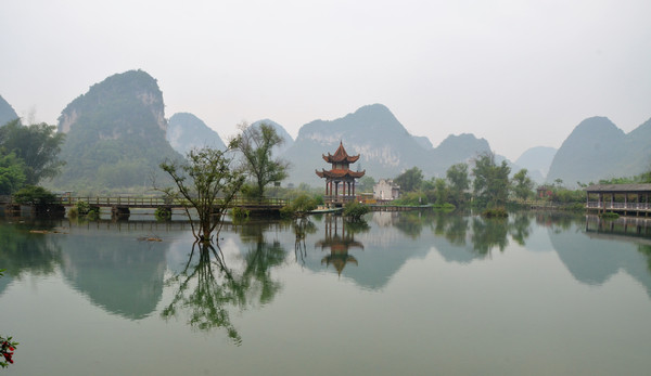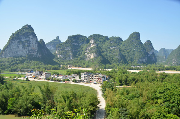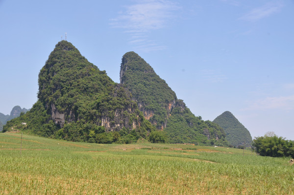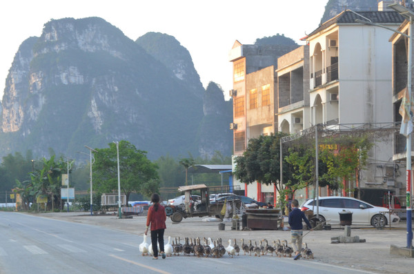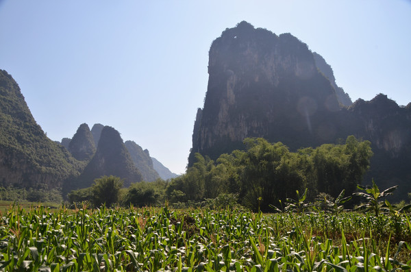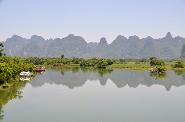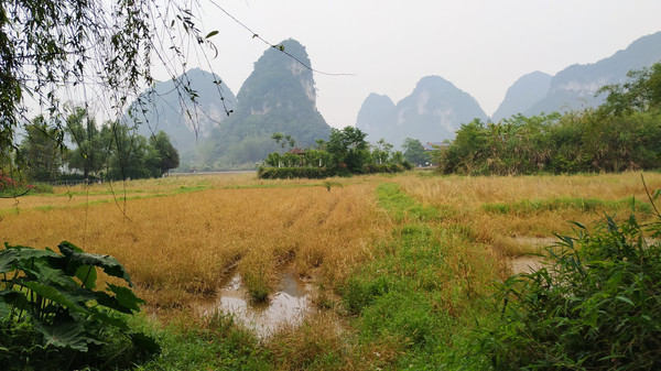 早餐之后,我们开着车在名仕村兜了一圈:明仕田园山水之间皆是稻田,眼光所及皆是绿色,在绿色之中,到处点缀着形态各异的山峰,在山峰点缀下的绿色之间,静静地流淌着弯弯曲曲的清清小河,仿佛是翡翠的碧玉,清澈的河水中,是缓缓飘动的柔美水草,无数的鱼儿自由自在地徜徉在水草之间,几只鸭子游过,泛起无数的涟漪,打碎了山峰宁静的倒影并扩散到岸边。。。喀斯特地貌的美轮美奂在这里得到了充分的展示。(此景点免门票)