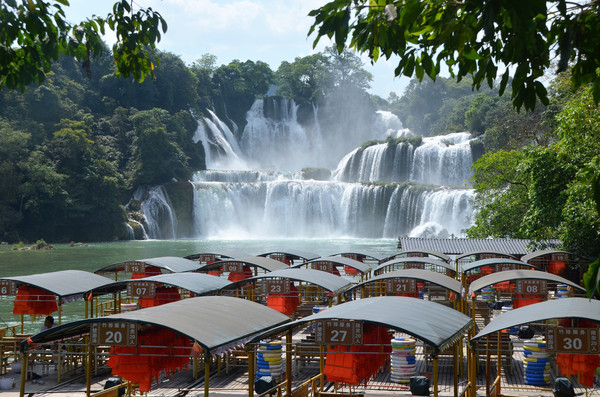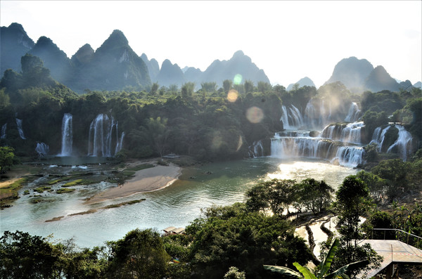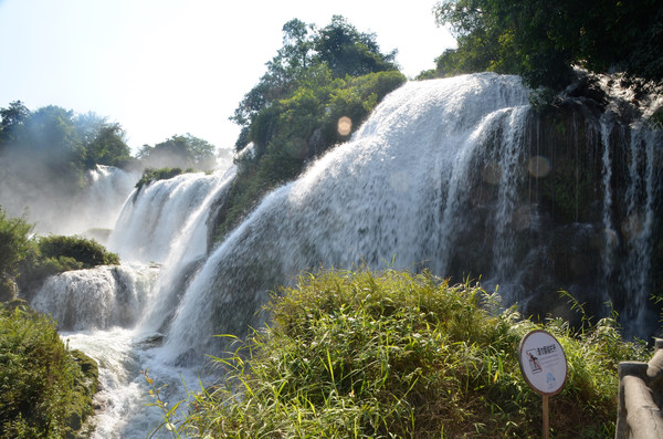 德天大瀑布位于广西壮族自治区西南山区,靠近中越边境的大新县境内.德天大瀑布发源于归春河的上游,自北南流的归春河被峙在江心的浦汤岛所阻挡,使河水激石咆哮,夺路而下,形成了横跨中越两国,宽约200余米,高约60米,纵深约70米,亚洲最大世界第四的跨国瀑布,年均流量50立方米/秒,是黄果树瀑布的5倍,终年有水,以归春河为天然国界,瀑布由多道高低不齐、大小不一的湍流流过丛林直落而下,呈三级跌落。远望德天瀑布,只闻水声轰鸣,响如滚雷。巨大的跌水分成数股飞泻直下,水花四溅,气势磅礴、蔚为壮观。德天瀑布与越南的板约瀑布相距30米(全景照片中左边的小瀑布是板约瀑布),电视剧《花千骨》也在这里取景。