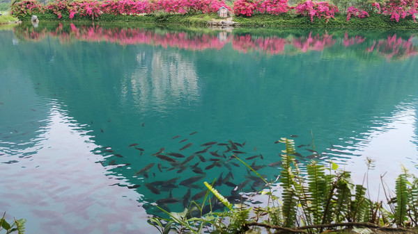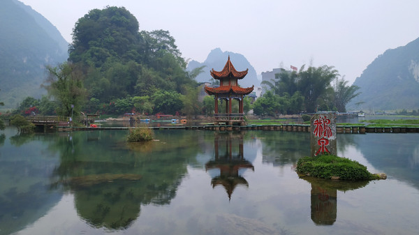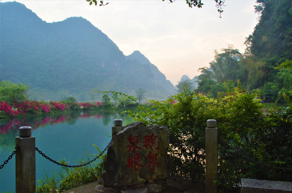 民宿老板温馨提示我们,早上7.30以前进鹅泉景区是免门票的,于是我们早早起床进景区溜达了,鹅泉是靖西八景之一,鹅泉与大理的蝴蝶泉、桂平西山的乳泉并称中国西南部地区三大名泉。鹅泉是一口峰林谷地中的上升泉,面积达50余亩的巨泉,泉水长年不竭,碧水潺潺,汇入深潭,然后继续东流,是德天跨国大瀑布的源头。泉眼处是一汪清澈见底湖水,碧绿如玉,如一块巨大的翡翠镶嵌在长寿坡山下,泉水清澈见底,大群的鱼儿在泉眼附近自由畅玩,鹅泉的的景观设计,将中国传统的园林风格与当地喀斯特地貌完美的融合,青山绿水、亭台楼阁、小桥流水、鱼儿、鸭群在这里是那么的和谐祥宁。长寿坡山上有三个观景台,登高望远,可将鹅泉美景尽收眼底,可惜天气不太给力,照片不足以反映鹅泉美丽的容颜。
