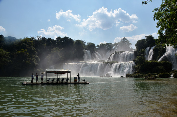 今天天气很好,艳阳高照,我们在酒店休息到下午三点才进入景区,景区里有游客不到一百人,在我们的行程中,这里的游客已经算是最多的了。对面的越南景区游客也是三三两两,我们中国景区竹筏是暂停开放使用的,在瀑布下游玩的一两艘竹筏是越南游客的。