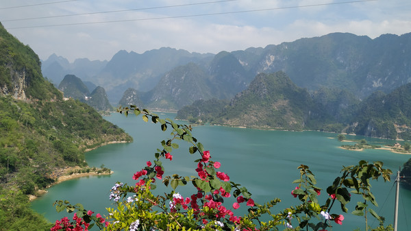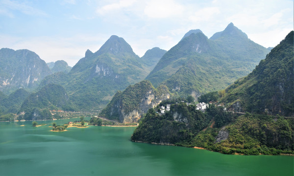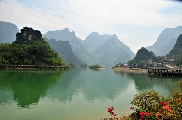 告别鹅泉,沿着百色凌云方向进发,在高速公路上跑了150公里,再跑30公里省、县道,下午一点半来到浩坤湖景区,该景区位于凌云县伶站乡,距百色至凌云二级公路约5公里,湖面面积约20平方公里,浩坤湖是凌云这个高山林立的地方最大的一片水面,湖面宽阔,水质清澈,湖面四周山峦起伏,连绵不断 ,湖中独峰耸立,小岛显露,湖山秀美、岸线曲折,几十座山峰紧紧挟携着一湖碧水。自然风光十分优美,整个景区还在建设中,疫情期间,门票五折(25元/人)。湖边聚居着壮、瑶少数民族,民族风情独特,我们开着车沿着湖边兜了一圈,景区范围很大,游客稀少。