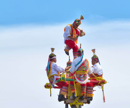 这是古印第安的宗教祭祀仪式,最早起源于西元前600年,至今已有千年历史,被列为“人类非物质文化遗产”。依照托托纳克人的传统,每当遇到饥荒和干旱时,这些“飞人”就是部落的信使,透过这种舞蹈形式向神贡献祭品,并祈求天降甘霖及谷物丰收。4名“飞人”相继爬到高度约15米的柱子上,面向东方,向太阳和众神祈求平安后,绕着柱子缓缓地盘旋向下飞行,配合着传统印第安音乐的旋律,在半空中舞动,如花开一瞬般静美。