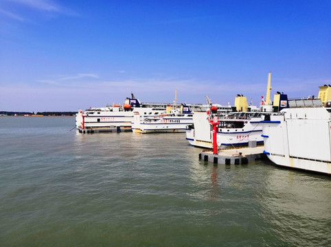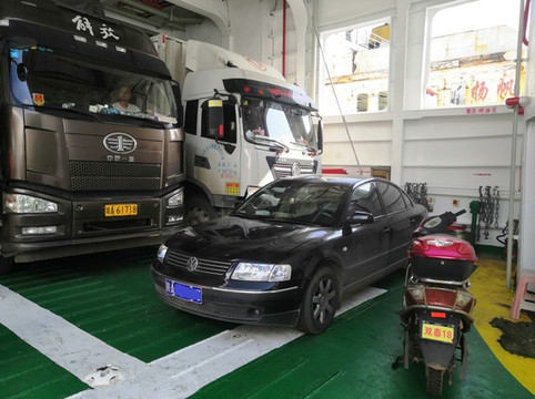 进港口前先在售票机上自助取票,而后驾车进入港口,通过安检,在码头排队,提前1小时即可开车驶上渡轮,车停在底舱,人需要坐在甲板上的舱室内。