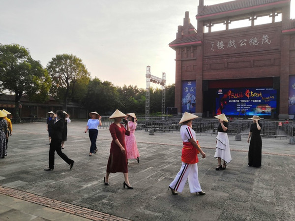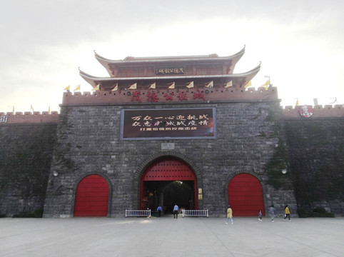 类似天安门的建筑称为茂德公古城,在网上查得知,茂德公古城是广东茂德公集团2013年投资3亿多元倾力打造的人工景点,外形远看酷似天安门。城内的主题是吃喝玩乐,目前疫情期间,人气不旺,店铺的饭菜还不错,戏楼前有排练走秀节目的大妈们,为即将举办的广场舞大赛做准备。