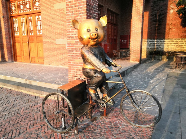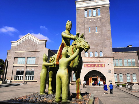 博物馆门囗的雕塑“骑士俑”是博物馆的镇馆之宝、南朝时代的文物“青瓷骑士俑”的形象。