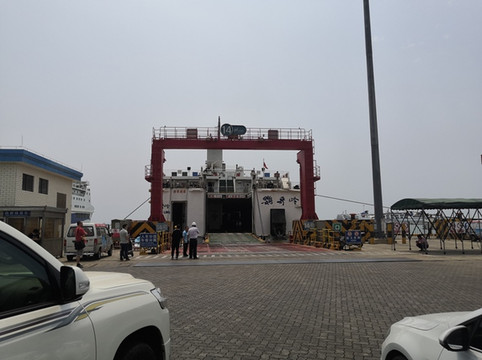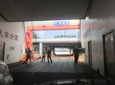 渡轮到达徐闻港,舱门打开,车辆准备下船。