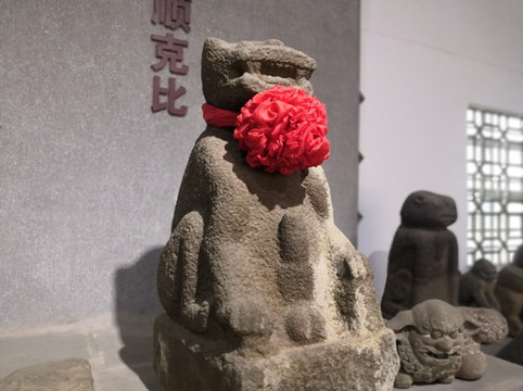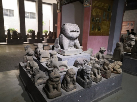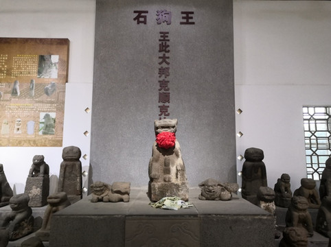 博物馆的石狗展很具地方特色,雷州人自称为狗的后人,崇拜狗图腾,但又喜食狗内,这似乎有点矛盾。石狗以突出生殖器为特色,博物馆中的石狗王,其生殖器是所有石狗中最硕大的,因而称王。石狗王背后书写的“王此大邦克顺克比”是一句古语,来自先秦佚名所作的诗经《皇矣》,描述天神对周文王的赞许。“王此大邦克顺克比”的大概意思是,大王统领如此泱泱大国,万民亲附百姓顺从。