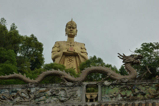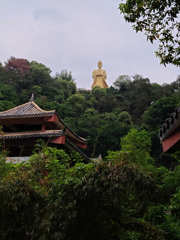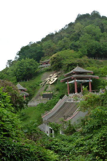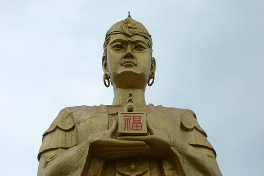 龙母庙的建筑看起来好像都是新建的,相应的故事都是传说。参观龙母庙一路登山,山顶矗立着高38米的手托福字金印的龙母塑像,塑像采用五龙施法、护母返航的传说,龙母站立在五龙身上手托金印,五龙是龙母之子。