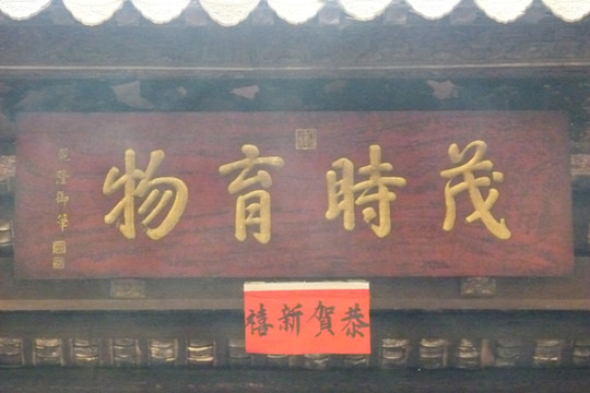 正殿供奉陈文玉的神像,正殿上方悬挂有乾隆题写的匾额“茂时育物”,此语出自《易.无妄》,“先王以茂时对时育万物”,意思是努力育养。