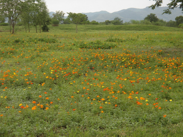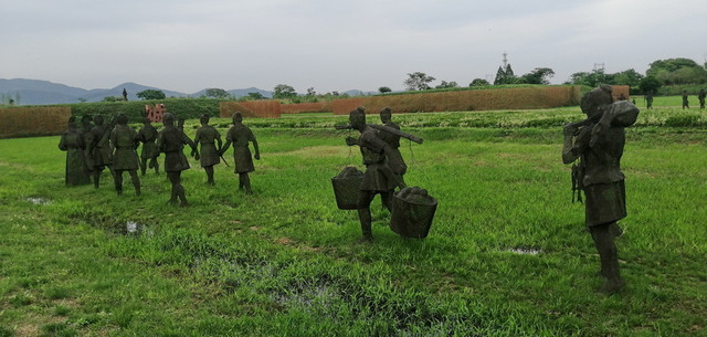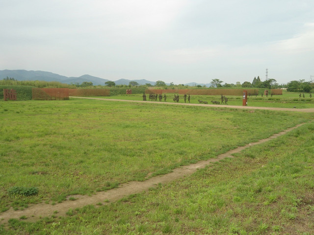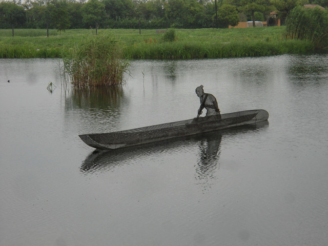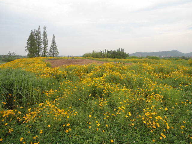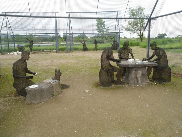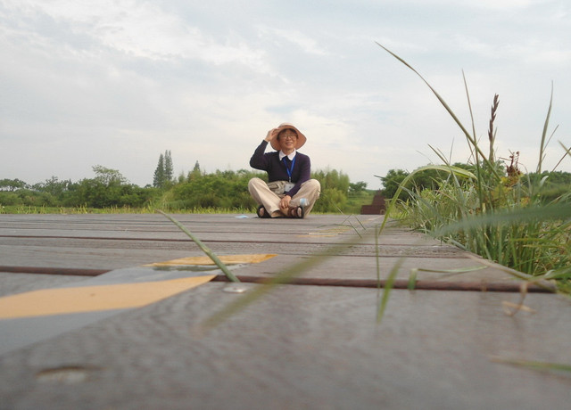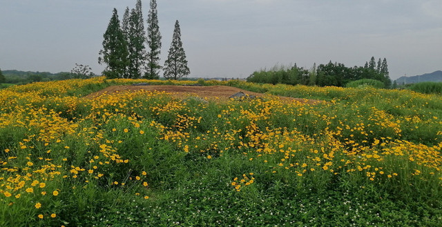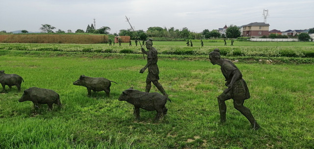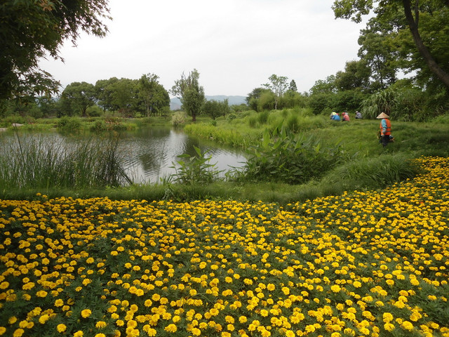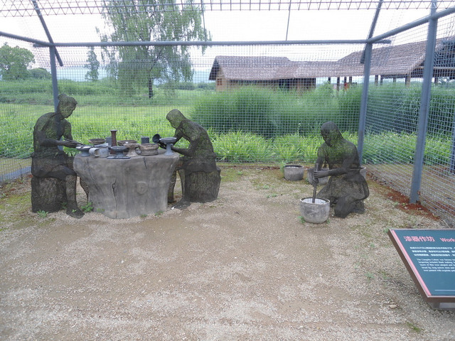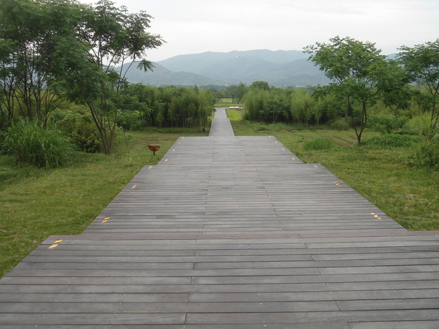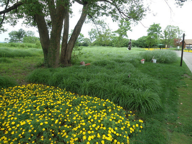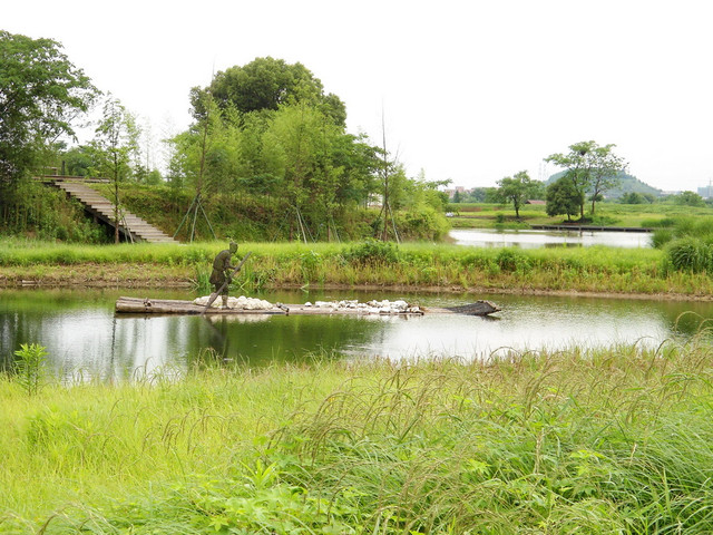 说回良渚,我是从湖州去的良渚,其实良渚离杭州也不算远,如在假日大约杭州附近的人都能一天来回了,这里“地大物博”,听保安说,走一圈要七公里,我本来就走得很累了,我只走了半圈,园中有那种电动车或双人脚踏车出租,一部80/40每小时不等,保安看我这样,说恐怕你自己一个人骑不动,我想也是,就只好迈开双脚长征,我其实很享受在那空旷无人的野地里慢慢步行的过程,看花看草看古迹,站在那原始的城垣上,睹景思人,想着原始人,我们的老老老祖宗当年会是怎样一种生活。我特别喜欢他们很有创意地用黑色钢丝网做成一个个远古人轮廓,,放在旷野里,那么一群人或放猪、或渔猎,它缔造了一种新的意境,带有一种通透,看穿历史的感觉。