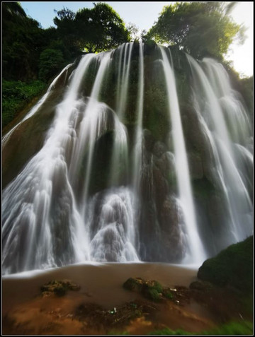 由于地势多变、地形落差大,滩多水急,在爱布一带沿河形成了许多大大小小的瀑布群,相距仅在600米,瀑布最高为42米,最宽为50米。