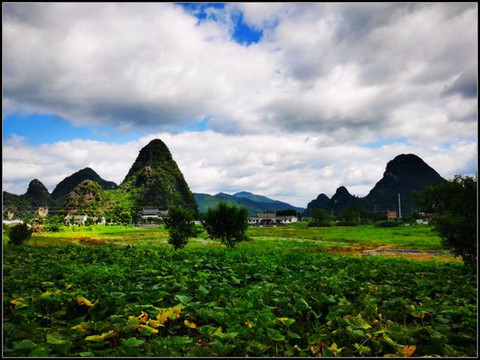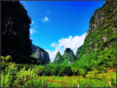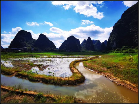 百里水墨画廊位于 贺州 市 钟山县 境内,属喀斯特峰林地貌景观,因为疫情,这里没有什么游客,只有我们4人在里面游玩。景区很大,烈日下靠步行是不行的,发现从景区旁边的村子可以开车进入绕进景区。