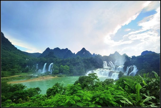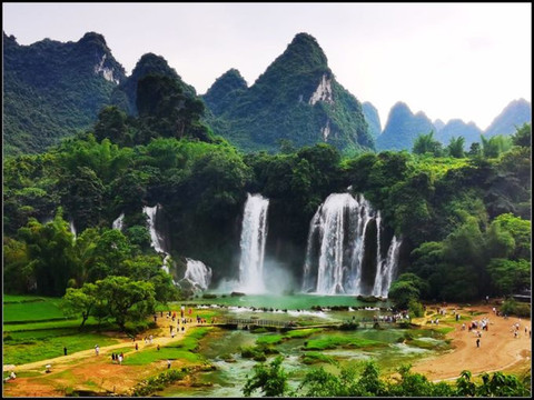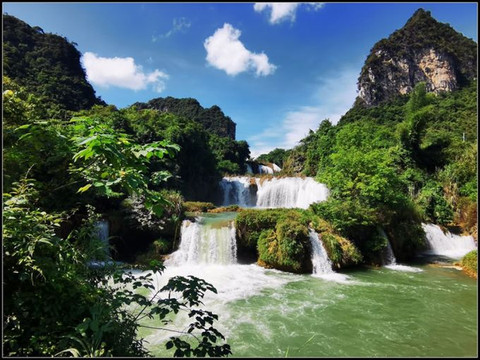 德天瀑布位于 大新 县归春河上游,距中越边境53号界碑约50米。清澈的归春河是左江的支流,也是中越边境的国界河,瀑布气势磅礴、蔚为壮观,与紧邻的 越南 板约瀑布相连,是 亚洲 第一、世界第四大跨国瀑布,年均水流量约为 贵州 黄果树瀑布的三倍,为 中国 国家AAAAA级旅游景区。