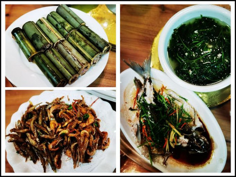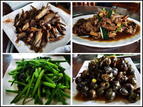 到鹅泉一定要吃大鹅。这里的黄皮焖鹅味道好极了,酸笋紫苏 大田 螺、酥炸小河鱼、清炒南瓜藤味道都不错。