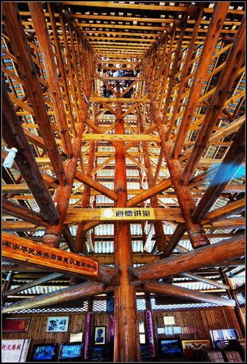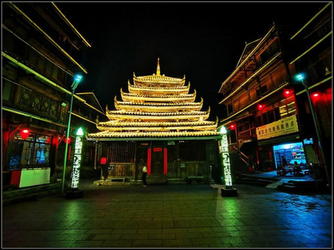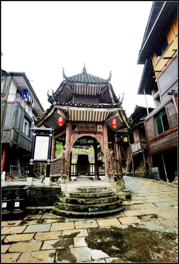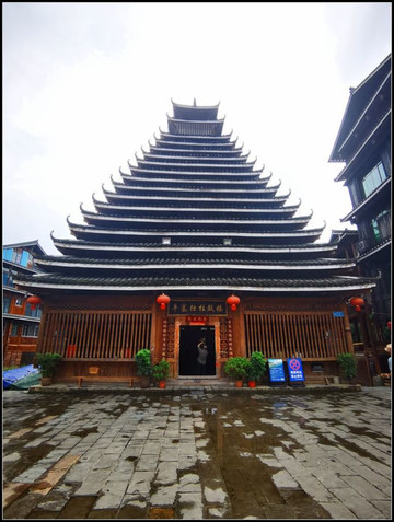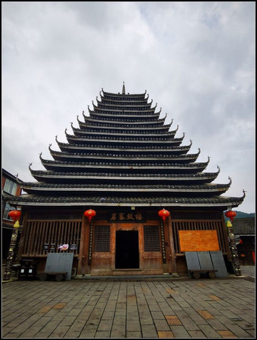 平寨独柱鼓楼。侗族鼓楼是侗乡具最地域特点的建筑物,流行于 贵州 、 湖南 、 广西 地区。鼓楼以防腐木木凿榫衔接,不用一钉一卯,由于结构严密坚固,可达数百年不腐不斜。顶梁柱拨地凌空,排枋纵横交错,上下吻合,采用杠杆原理,层层支撑而上。在古代侗族鼓楼还有作为开会场所、外敌入侵鸣鼓警示等作用。