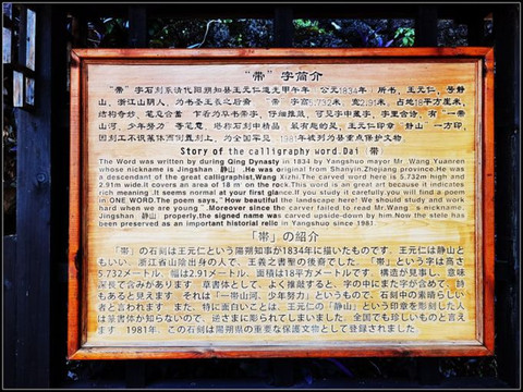 书圣王羲之后人王元仁在崖壁上所书“带”字,其蕴含着“一带山河、举世无双、年少努力、万古流芳”的笔意,一字可以辩出十六个字,堪称 中国 书法一绝。