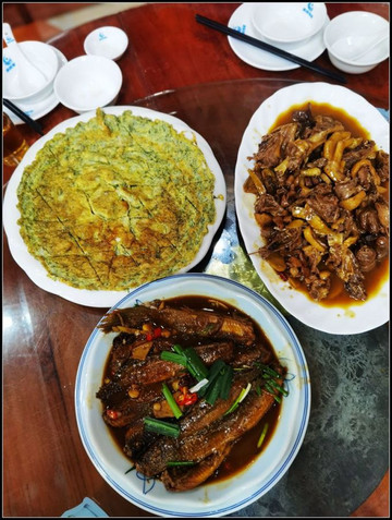 晚餐品尝黄皮焖绿头鸭、红烧泥鳅、海草煎蛋,味道不错。