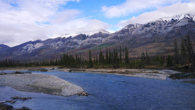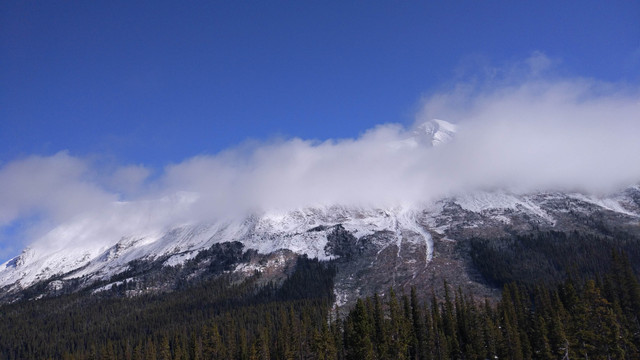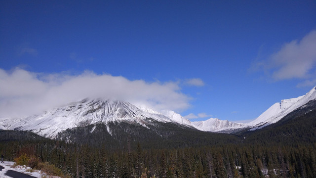 3、今天的行程最美也最长。早晨,从louise lake 直奔columbia icefield。途径bow lake,peyto lake,waterfowl lake,弓河很长,在很多地方可以见到,佩投托湖因天气原因关闭了。水禽湖车进不去,我们步行前往。我们在环抱路易斯湖周围的大山间穿梭。从各种角度观察这群山峦。这些山多数常年积雪,在蓝天白云的映衬上分外美丽。快到冰原有个大拐弯,人车被群山环抱。雪后初霁,整个的山峦都覆盖在白皑皑的冰雪之下,常年积雪的山顶更加洁白,长条的云像一根半透明白纱将几座山峰缠绕在一起,随风飘荡。93号冰原大道不愧为北美最漂亮的景观大道。