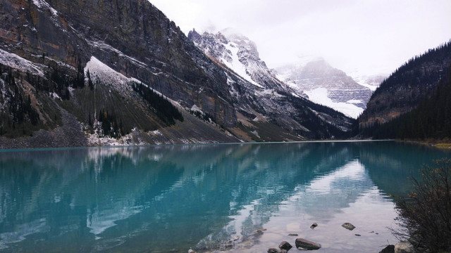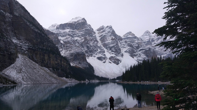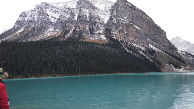 8分钟到达山顶,山上风雪交加,景物都在雾气笼罩之下。唯有近处的松树上的冰挂清晰透亮,让人惊喜的是居然在山上遇见熟人,他们比我们早来几天,太巧了。山上的无趣被这个惊喜扰动了。山里气温变化无常,刚才还是白雪飘飘,到了louise湖已经艳阳普照了。