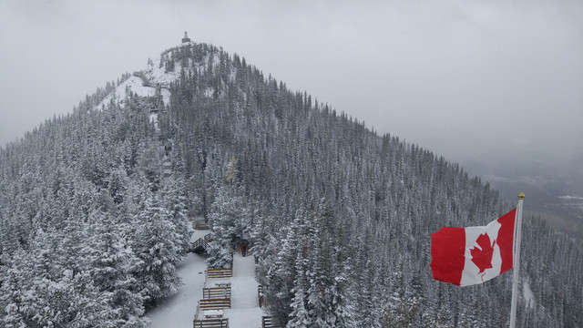 2、第二天朋友推荐在朱砂湖看日出,不过早晨阴沉沉的,路面的冰雪神奇的化了,不看日出,看看朱砂湖吧。朱砂湖在进入班夫的岔路上,一共有4个湖,没有醒目的标识,也没有游客,看到一个湖就停下来,下车走走。小径上唯有动物和我们的脚印。野鸭子看到人快速游过来,第一个湖很小,继续前行。天气逐渐放晴,湖面升起白雾,周围的树木不再绿了,呈暗红绕着湖生长。越往里走,路上积雪越厚。后面的湖一个比一个更好看。沿着小径向坡上走去,原来是来时的高速路。这条小径应该是路人看到美景下车徒步走出来的。在淘宝上定了11点的硫磺山缆车,不敢久留直奔硫磺山。正常的出口被关闭了,只能绕道,其实距离并不远。进入停车场,车很少,山上雾气腾腾,还飘着雪,现在上去什么也看不到。我们掉头去了温泉,路很滑,这里的车稍微多些,露天的泉眼喷出热腾腾的泉水,室内的温泉规模很小,容纳不了多少人。天晴了些,转头再去硫磺山缆车,停车场的车多起来了,这条缆车叫gondola,和威尼斯的游船一个名字。