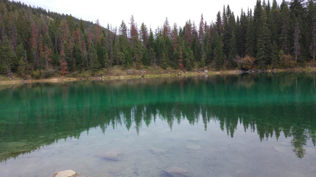 就要结束这一天的路程了,在行驶在回jasper的途中,我们看到有游客从不知名的景点出来,因为时间尚早,于是下车去看看。上山的路并不宽阔,走了一段时间,四周无人,只见山和茂密的树林,不知道湖在哪里。这时有一对游客向我们走来,赶紧上前问还有多远。他们说距离第一个湖还有一段路,不过非常美值得去。我们半信半疑那就看看这个湖,这几天美丽的风景萦绕在眼前,壮美的雪山、冰川、清澈美丽的湖水各个让人流连忘返。卡尔加里最美的风景都已遇见,对这5个不知名的湖并没有期待。在林子里走累了,已经快迷路了,什么湖也没见到,忽看到一个小小的指示牌第一湖向右,第二湖向前。往右又走了不知多远,快绝望的时候,在树林中间的缝隙里出现一条碧绿。小伙伴加快脚步率先跑到的湖边,向我们呼喊。这是一块绿色的宝石镶嵌在两山之间。湖狭长,湖面没有一丝皱褶,平静安详的在那里静静的守候。来这里的人不多,湖也没有美丽的名字,像是个灰姑娘,等待着王子的出现。第二个湖在另一个方向,她们从来没有见过面,却是同样的美丽,这里的湖水分两色,近处是银色的镜面,远处是由浅入深的不同绿,像是进入了童话世界,遇到游人我们相视一笑都在为彼此能欣赏这般美景而欣慰。太阳下山了,路不熟,3、4、5湖我们只能从山上远远的眺望,夕阳给湖水铺上一层金黄。深在闺中人不识,她们静静在深山中流淌。