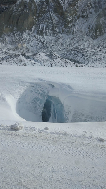 冰原车的6个巨型轱辘,每个有一个人高,深深的凹模抓地力极强,遇到对面反方向车时,冰原车在60度以上的坡道上刹车,车稳稳的停止在路面。去冰原的路是用沙土铺成的,每年旅游季后,大雪将掩埋住沙土路,第二年,在新的地方重新铺路。到达冰川莫名的激动,为了保护冰川,游客可活动的范围有限。从淡蓝绿色的冰缝处往下看不到尽头,自然产生的冰洞中有水在流动。Skywalk是2014年建成的,但是比起国内的天空桥显得小儿科,并没有峡谷之上的感觉。
